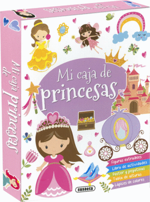 Mi caja de princesas contiene un libro de actividades, figuras extraíbles, un póster, pegatinas, lápices de colores, una tabla de altura... ¡y muchas princesas!